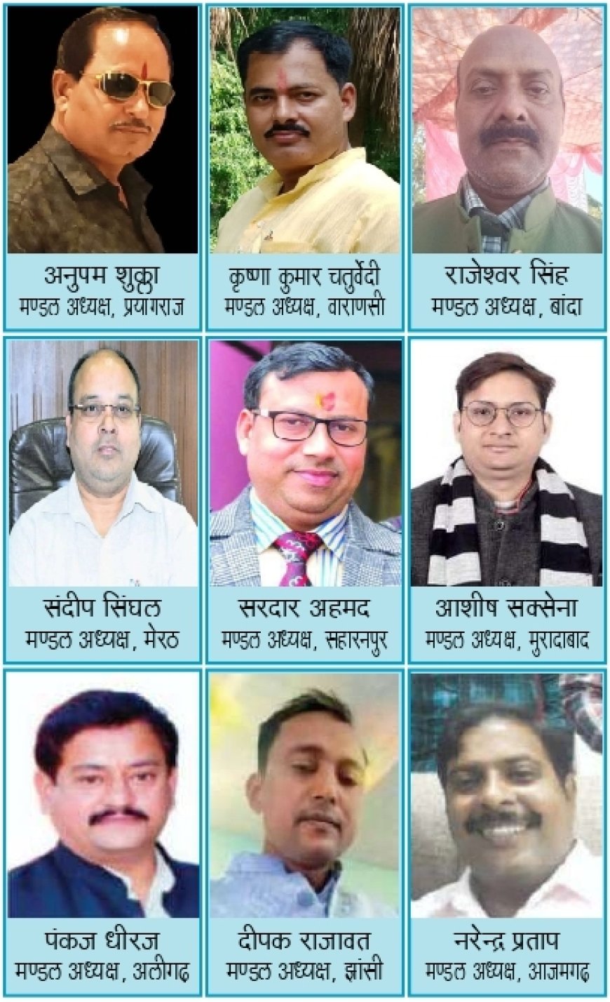 प्रदेश अध्यक्ष शोएब अहमद ने प्रथम चरण में मंडल अध्यक्षों के नामों की घोषणा करते हुए जानकारी दी कि मेरठ मंडल के संदीप सिंघल, सहारनपुर मंडल के सरदार अहमद, अलीगढ़ मंडल के पंकज धीरज, लखनऊ मंडल के अनिल सिंह, वाराणसी मंडल के कृष्ण कुमार चतुर्वेदी, प्रयागराज मंडल के अनुपम शुक्ला, मुरादाबाद मंडल के आशीष सक्सेना, मृत्युंजय शंकर सिन्हा गोरखपुर, दीपक राजावत झांसी, राजेश्वर सिंह बांदा, नरेंद्र प्रताप आजमगढ़ व राजेश पटेल मिर्जापुर के लिए नियुक्त किये गये हैं।