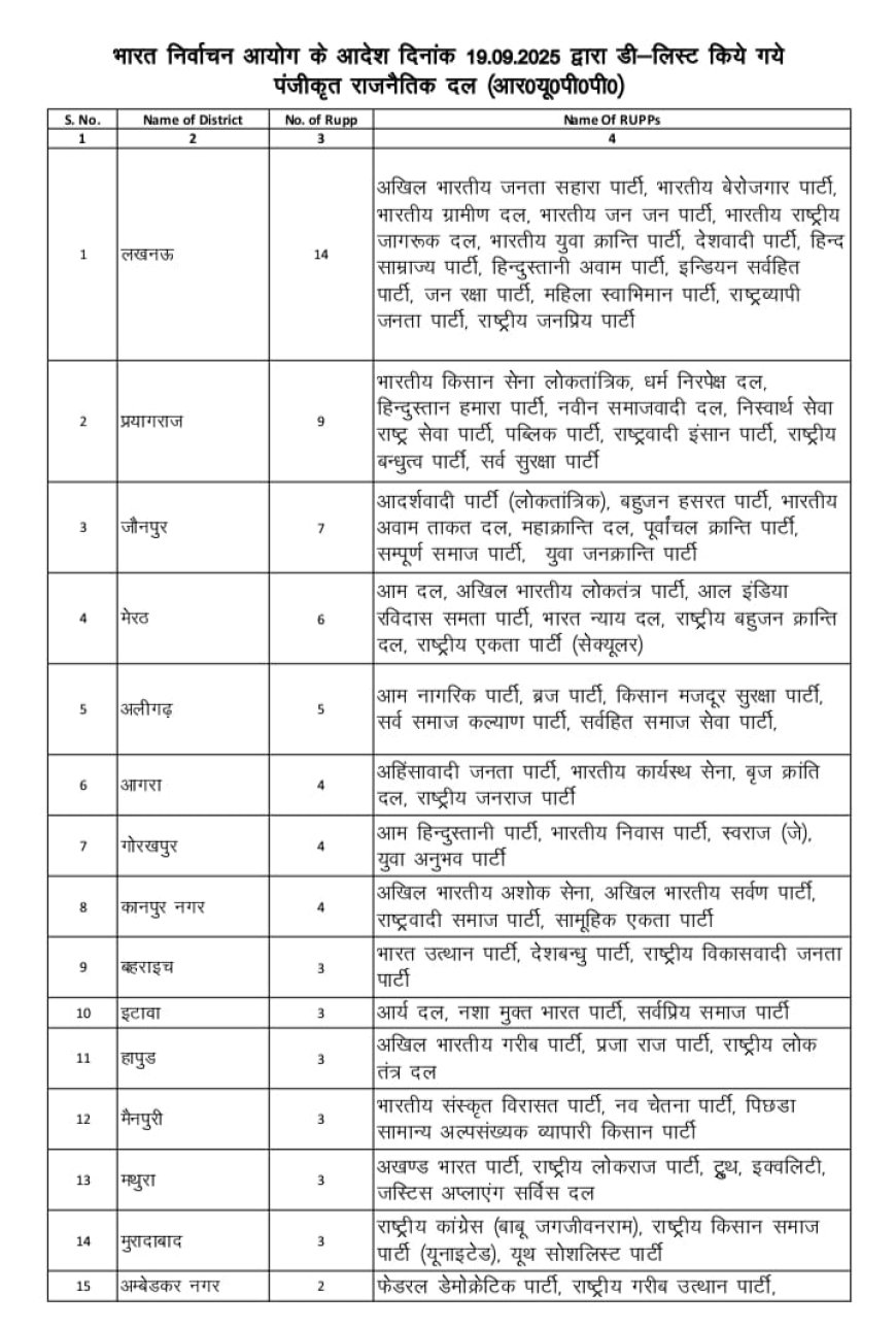 लखनऊ। मुख्य निर्वाचन अधिकारी नवदीप रिणवा ने बताया कि भारत निर्वाचन आयोग ने अपने आदेश 19 सितम्बर 2025 द्वारा उत्तर प्रदेश राज्य के ऐसे 121 पंजीकृत दलों को पंजीकृत राजनैतिक दलों की सूची से बाहर कर दिया है, जिन्होंने वर्ष 2019 से लगातार छह वर्षों तक न तो विधानसभा और न ही लोकसभा का कोई चुनाव लड़ा है। उन्होंने बताया कि इन दलों को लोक प्रतिनिधित्व अधिनियम, 1951 की धारा 29बी एवं धारा 29सी, आयकर अधिनियम, 1961 के प्राविधानों तथा चुनाव चिन्ह (आरक्षण एवं आवंटन) आदेश, 1968 के तहत राजनैतिक दलों को प्राप्त होने वाले किसी भी लाभ का अधिकार अब समाप्त हो गया है।